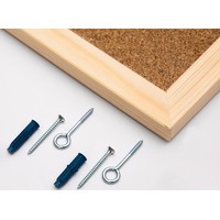 Пробковая доска в деревянной рамке. Поверхность доски из натуральной мелкозернистой пробки. Возможность прикрепления информации с помощью кнопок-гвоздиков и булавок. Рамка из натурального дерева. Скрытое крепление к стене в двух углах.